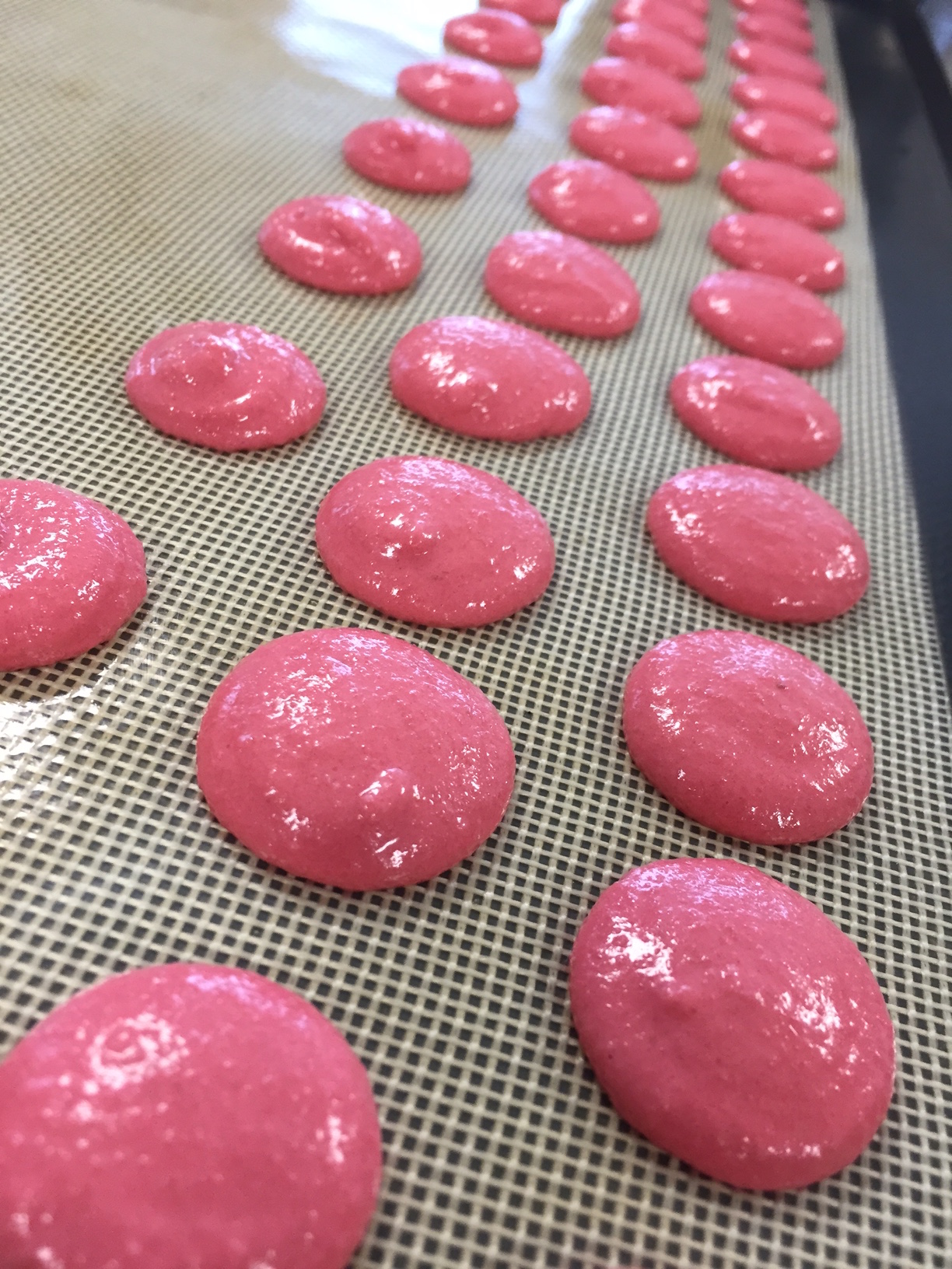 - If you used the Italian meringue, pipe it onto a Silpat. If you used French, use paper. This is something we did wrong in the SLT class and I remember he had such a tough time getting them off of the sheet. Same thing when we made them again!