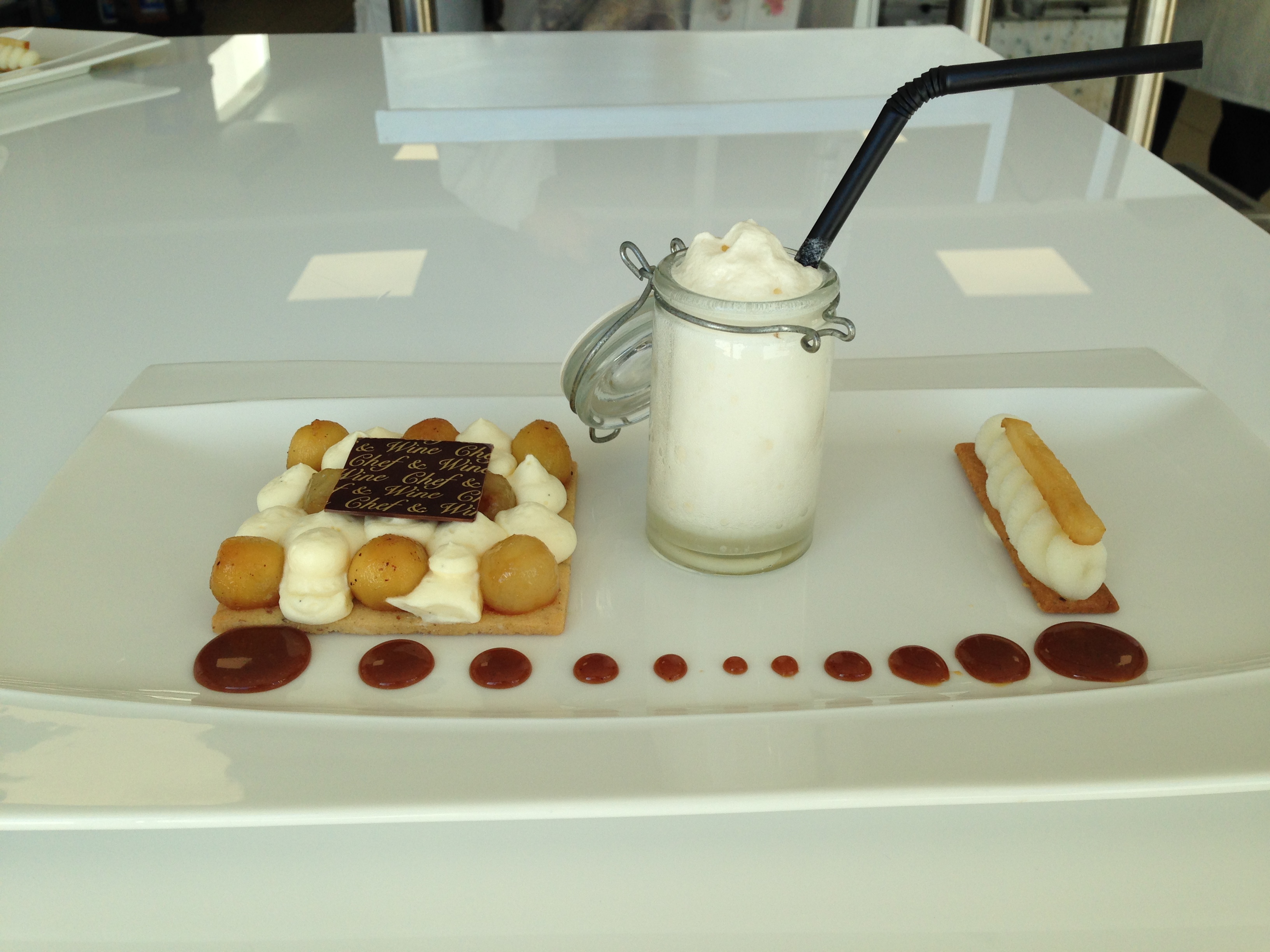 - An apple and pear tart with an apple-sorbet milkshake. Also delicious, and finally something with fruit in it! But don’t worry, the fruit was carmelized in sugar and honey.