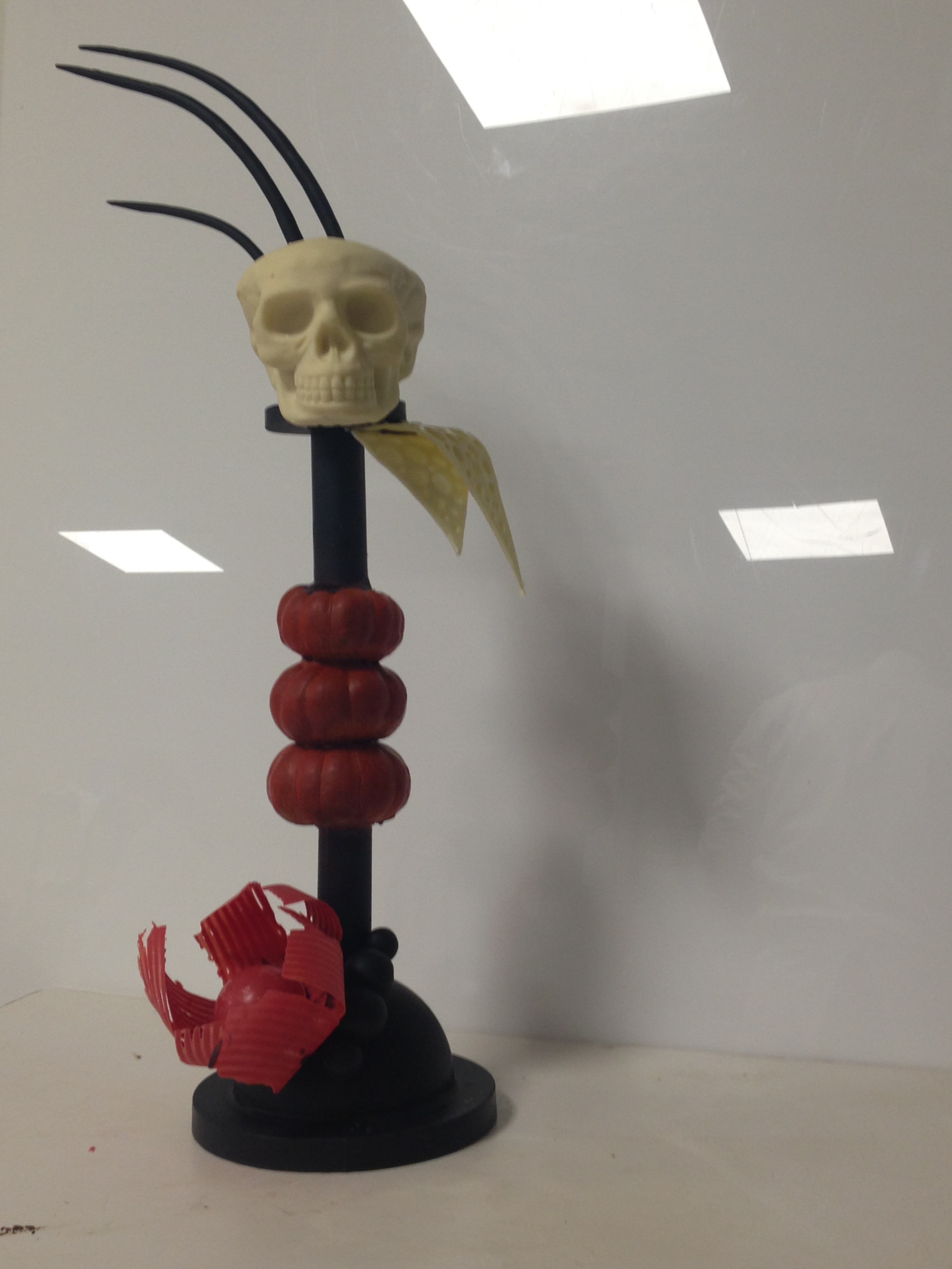 The whole thing is edible and made of chocolate. We learned a bunch of different techniques on how to form and shape the pieces (including making a mold of different things, like the skull = awesome), how to attach them, how to color and paint it, etc. It was a really cool thing to learn even if I won’t be making a showpiece anytime soon. But I might have to break out the chocolate skulls for Halloween.