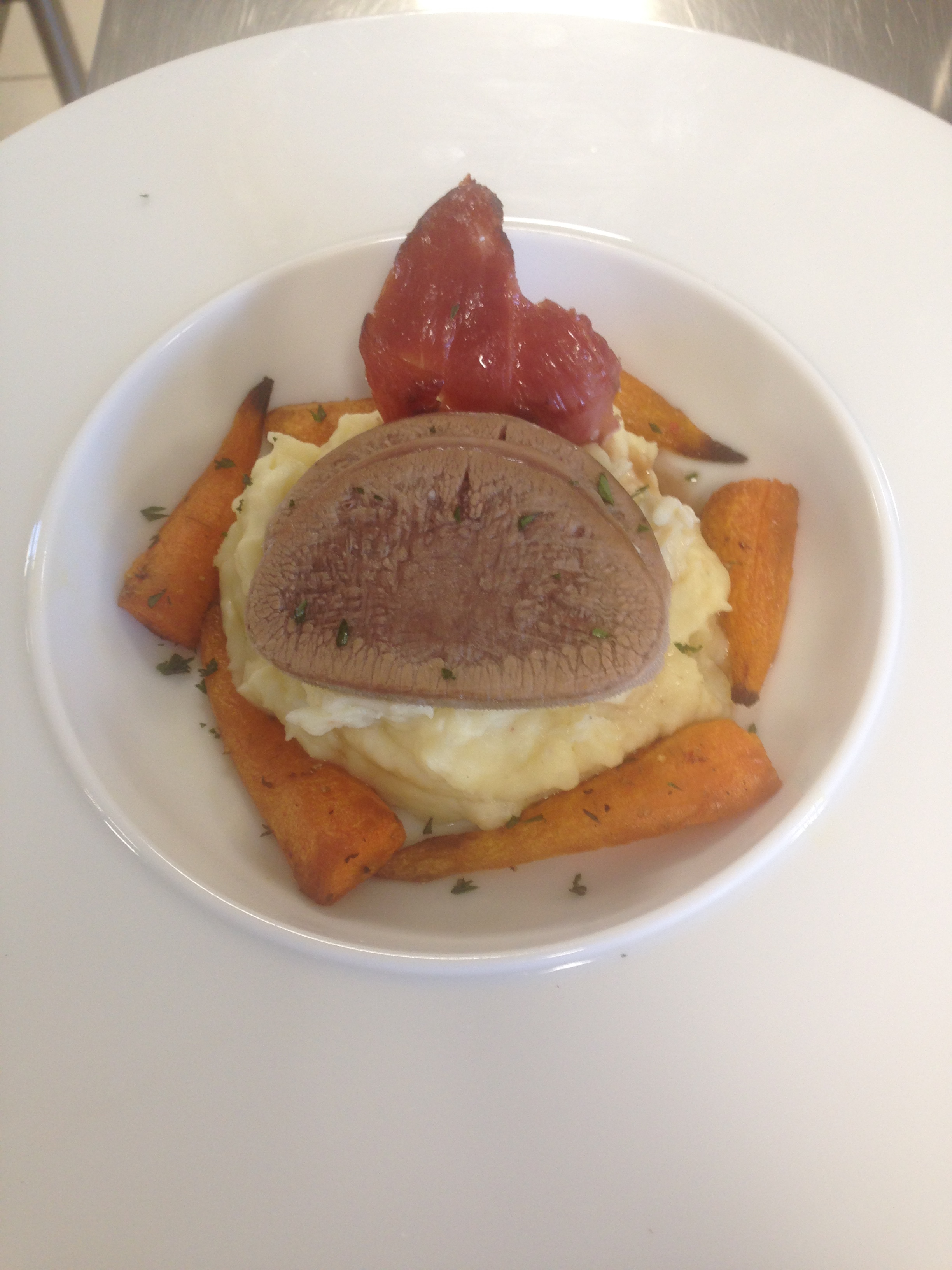 - Beef bourguignon: a French classic. Sort of like a beef stew with red wine sauce. We also made our own twist on the dish the next day (above), using the same ingredients and trying to get the taste of the stew but not a stew. I made mashed potatoes with a mushroom/red wine sauce volcano inside, roasted thyme carrots, beef, and crispy pork belly.